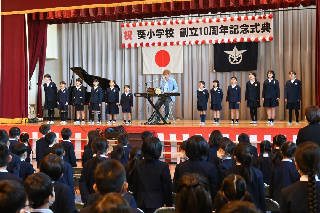 茨城県茨城町長岡の町立葵小(藤井とし子校長)の創立10周年記念式典が8日、同校体育館で開かれた。同校歌を作詞作曲した音楽家の…