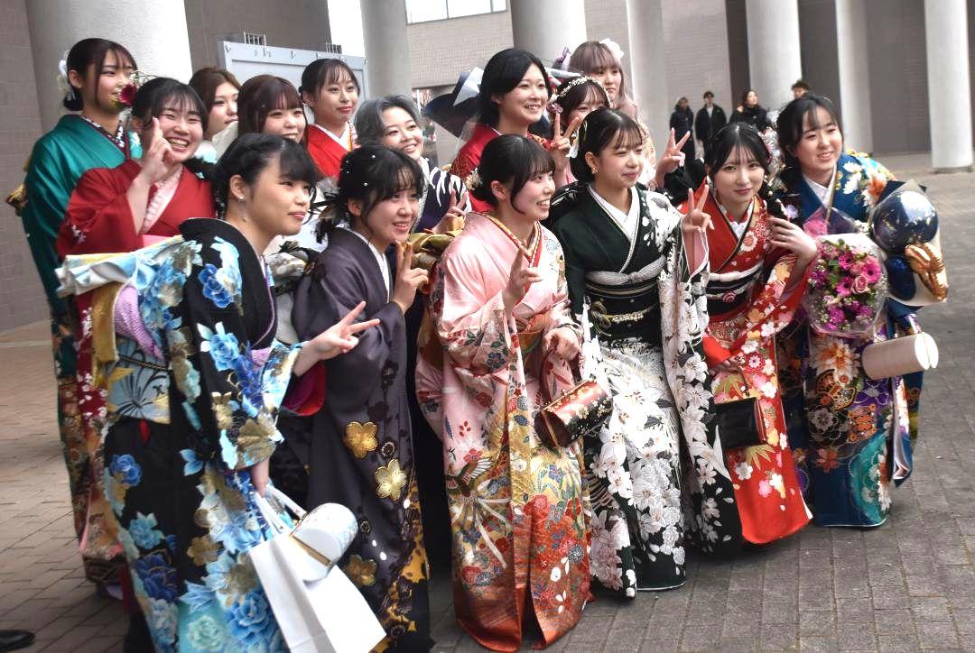 茨城県鉾田市の「二十歳の集い」(同市主催)が11日、同市当間の鉾田総合公園で開かれた。スーツやはかま、着物に身を包んだ若者…