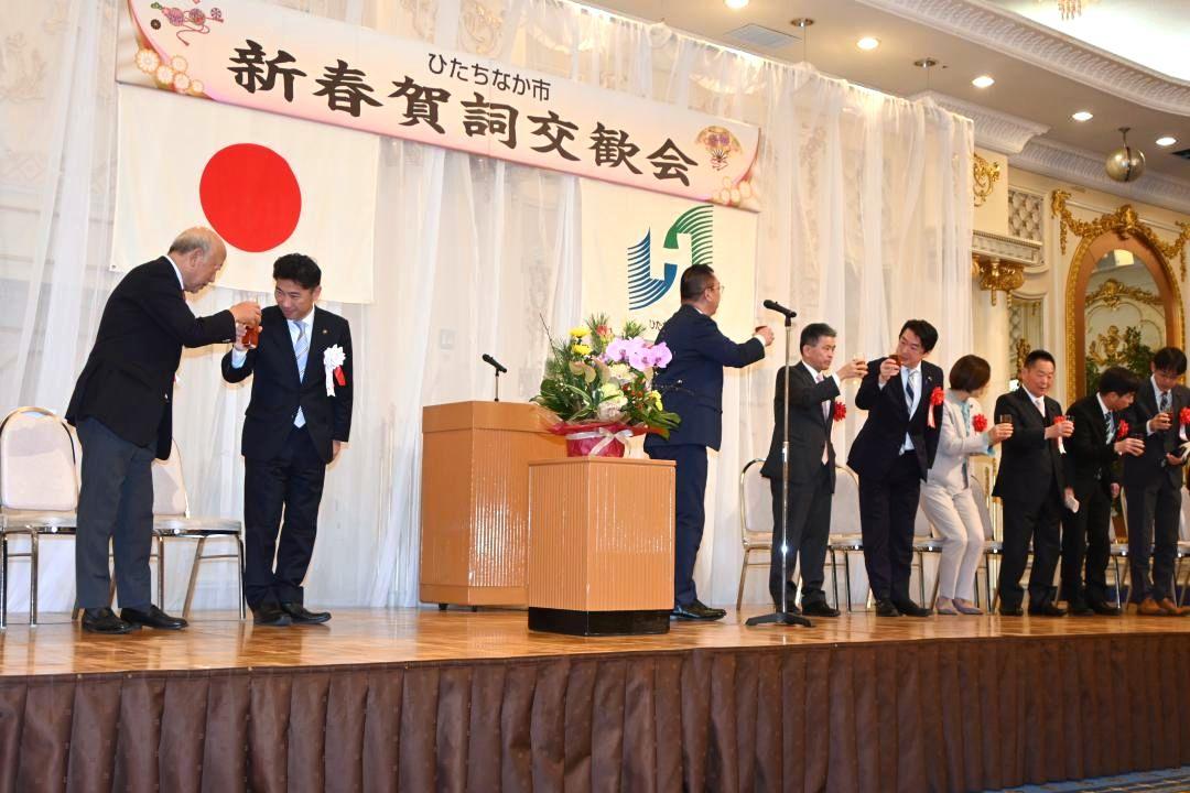 茨城県ひたちなか市の新春賀詞交歓会が7日、同市大平のホテルクリスタルパレスで開かれた。市内各界の代表者や来賓の政治家ら約…