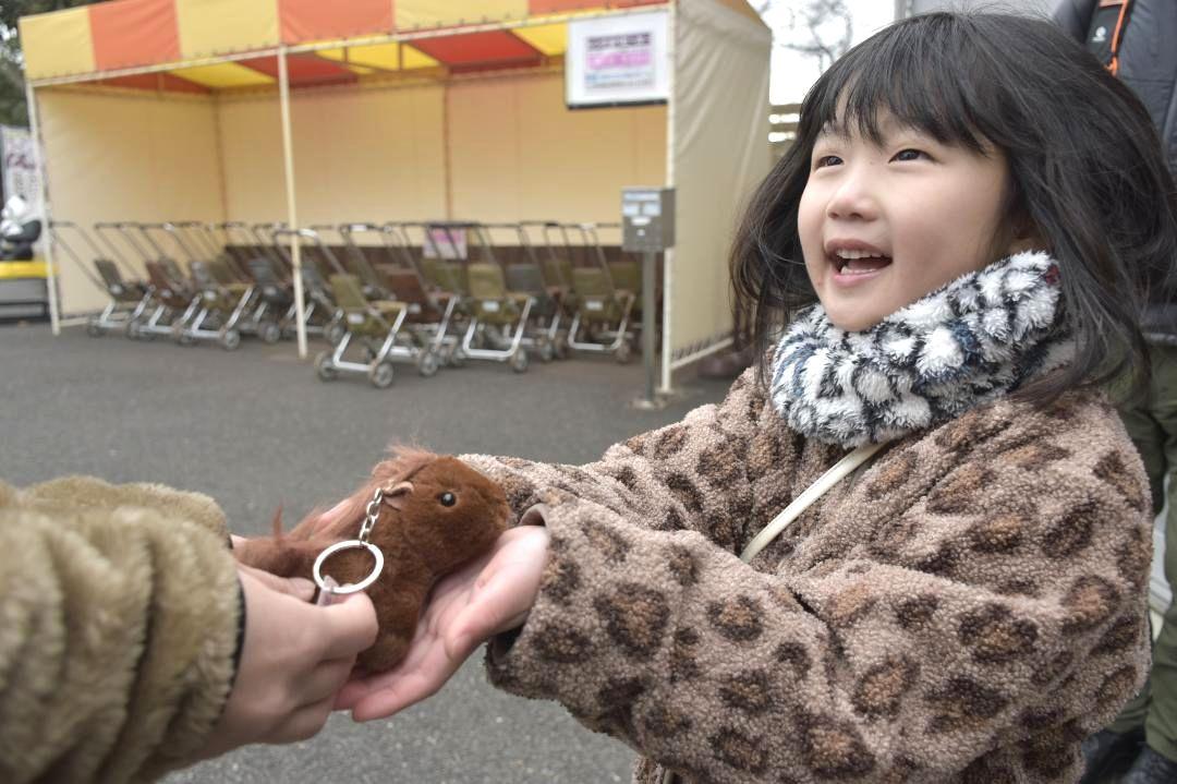 今年の干支(えと)「午(うま)」にちなみ、茨城県日立市宮田町の市かみね動物園は2日、来園した子どもに馬をモチーフにしたキーホ…