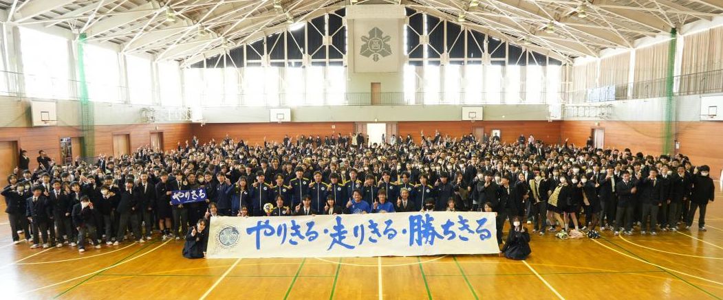 サッカーの水戸ホーリーホックの鈴木郁恵取締役執行役員や細川淳矢コーチ、本間幸司CROが茨城県常陸太田市栄町の県立太田一高(…