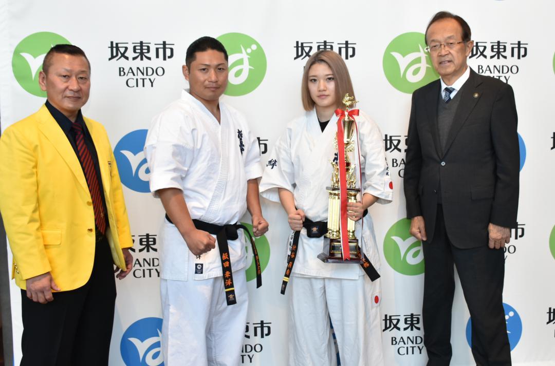 極真空手道の世界大会に出場した茨城県坂東市在住の針谷飛向さん(21)と飯田幸洋さん(38)が23日、同市岩井の市役所に木村敏文市…