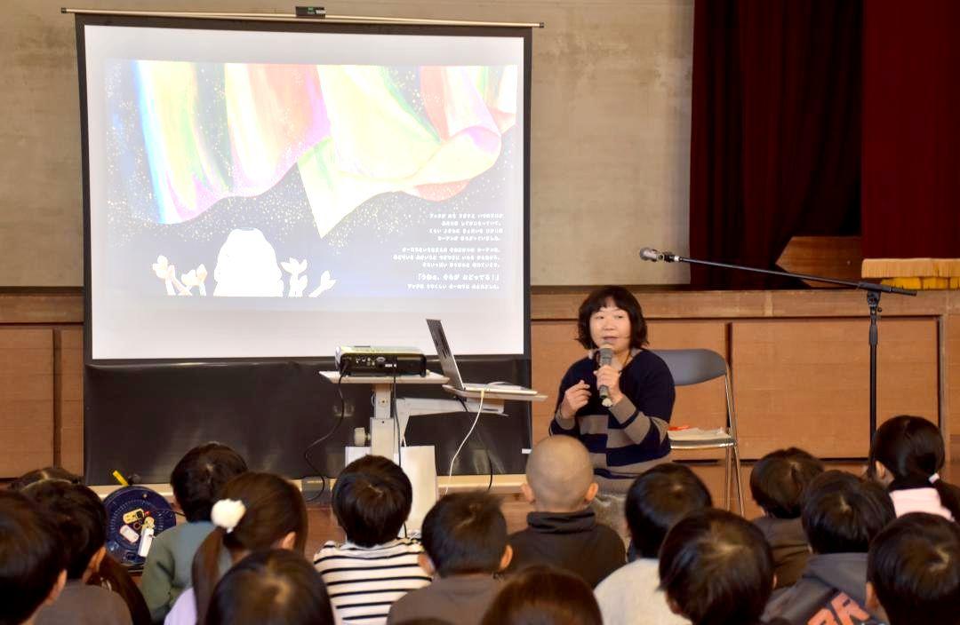 茨城県常陸太田市立金砂郷小(同市大里町、富永佐江子校長)は17日、同校体育館で、絵本作家でイラストレーターのあずみ虫さんを…