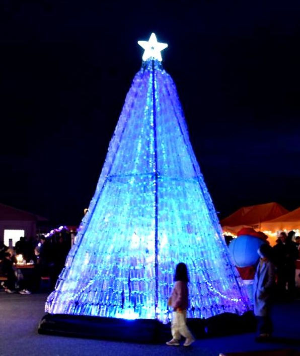 茨城県五霞町ごかみらいの「道の駅ごか」に、青く輝くペットボトル製のクリスマスツリーがお目見えし、利用者らの目を楽しませ…