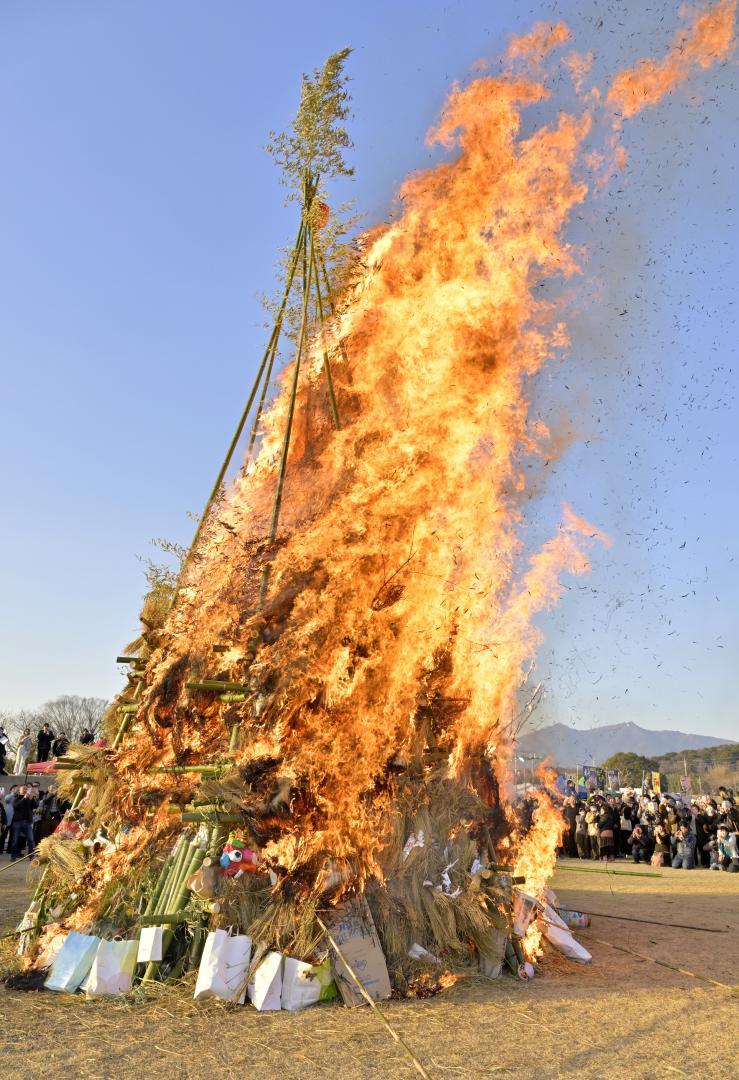 正月飾りなどを燃やして今年の無病息災を願う「どんど焼き」が17日、茨城県つくば市小田の小田城跡歴史ひろばで開かれた。今年…