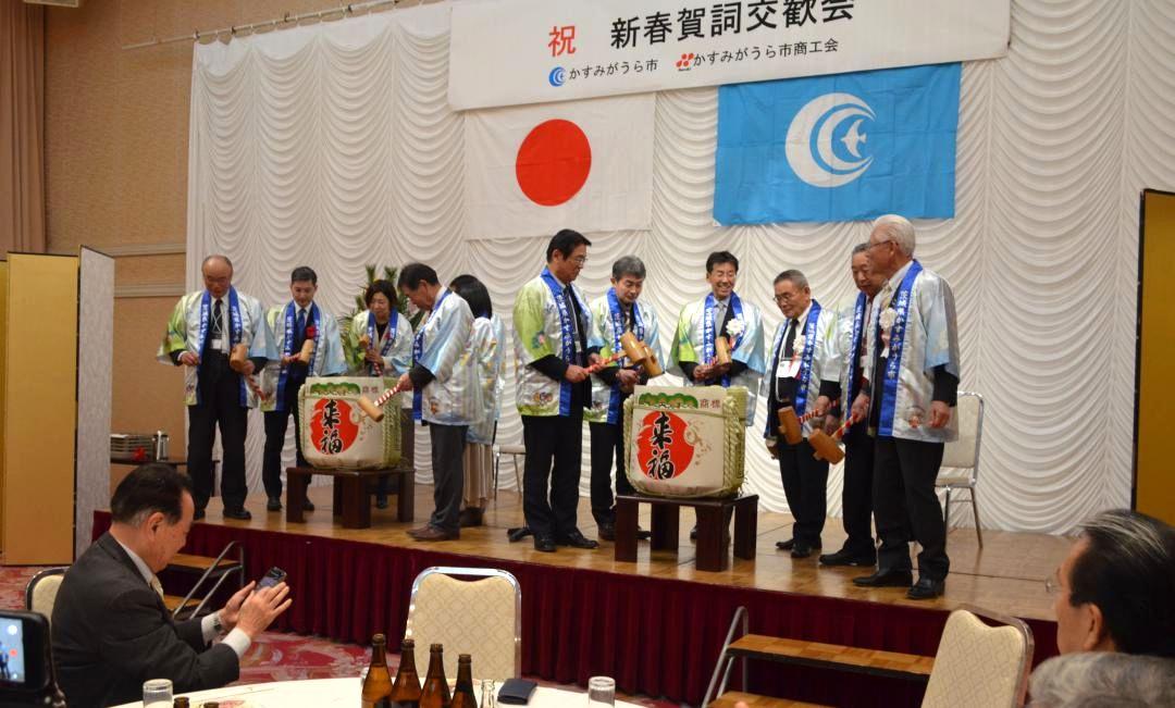 茨城県かすみがうら市の新春賀詞交歓会が16日、同県土浦市内のホテルで開かれ、各界から105人が出席して発展を誓い合った。かす…