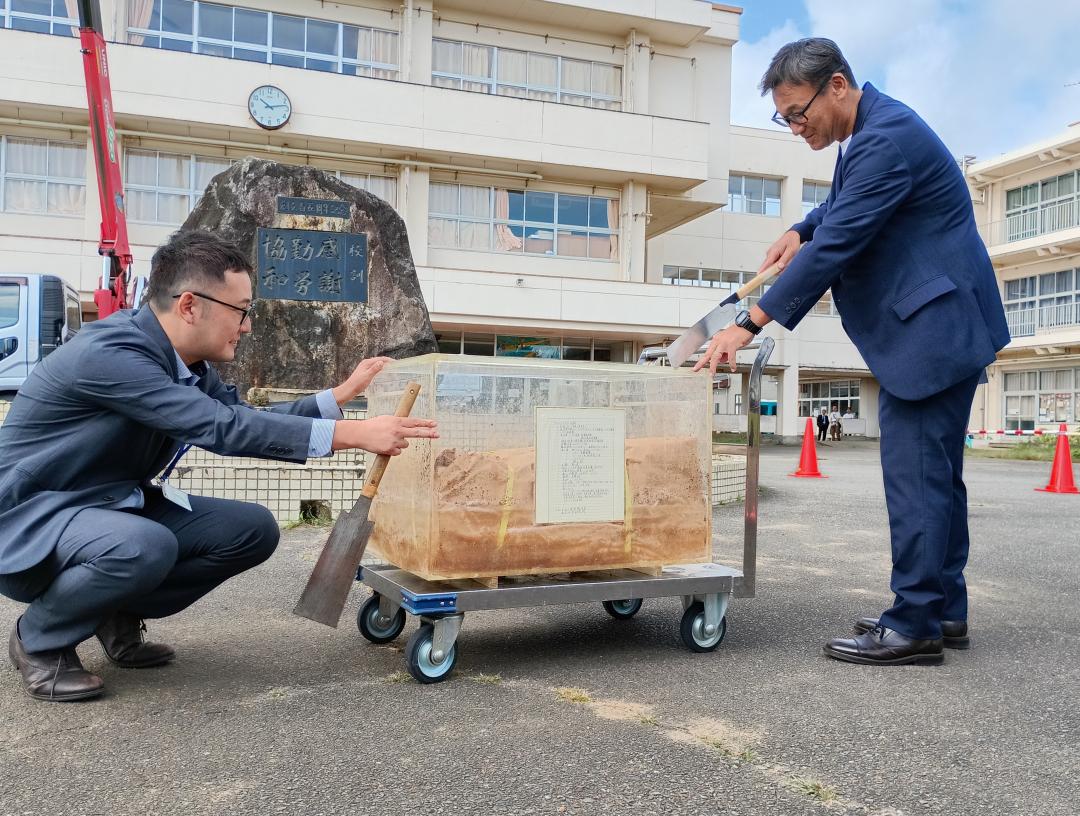 茨城県龍ケ崎市の市立龍ケ崎小で18日、44年前に埋められたタイムカプセルの開封式が開かれた。当時の在校生らが集まり、取…
