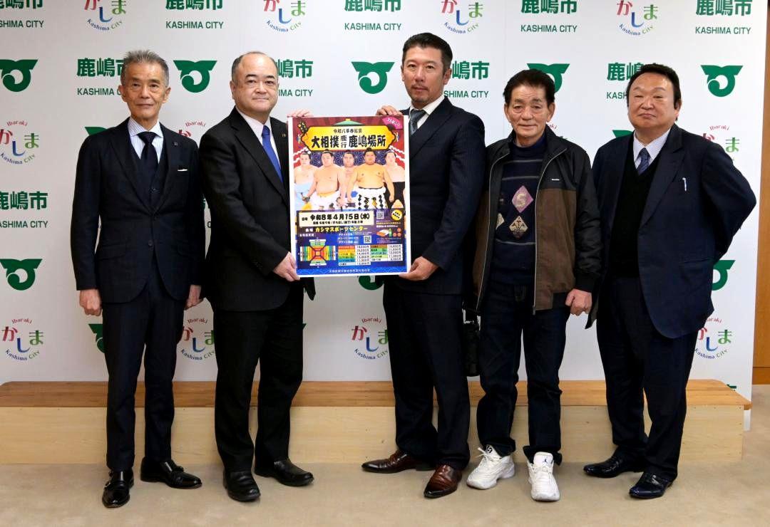 茨城県鹿嶋市で4月15日に開く大相撲春巡業「鹿行鹿嶋場所」の実行委員会関係者らが6日、同市平井の市役所に田口伸一市長を訪ね…