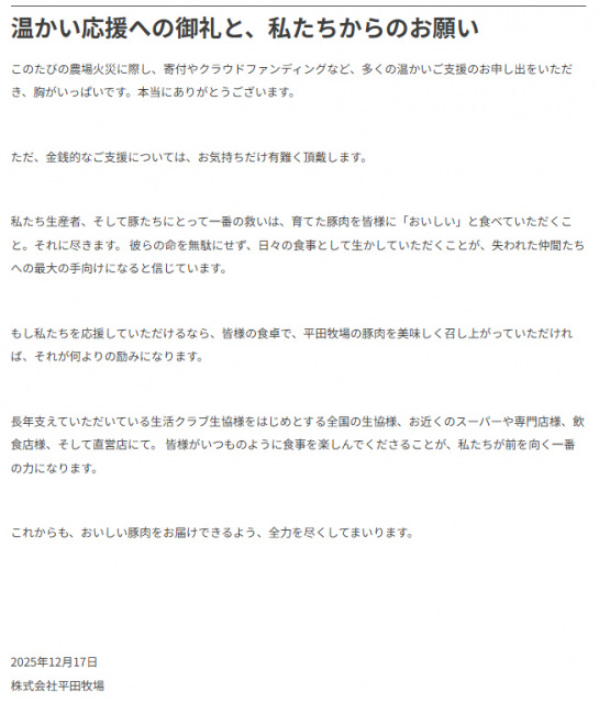 火災の平田牧場「失われた仲間たちへの最大の手向けに」メッセージ掲載 温かい励ましが続々
