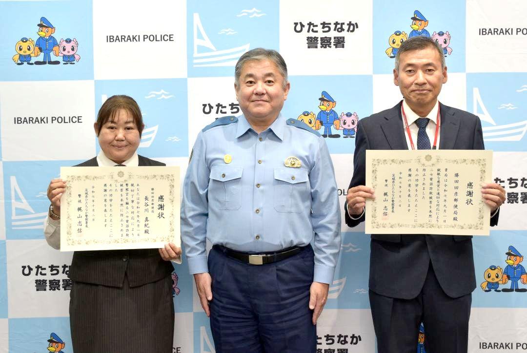 ニセ電話詐欺を未然に防いだとして、茨城県警ひたちなか警察署(梶山志信署長)は2日、勝田田彦郵便局(荻谷力局長)と同局員、長谷…