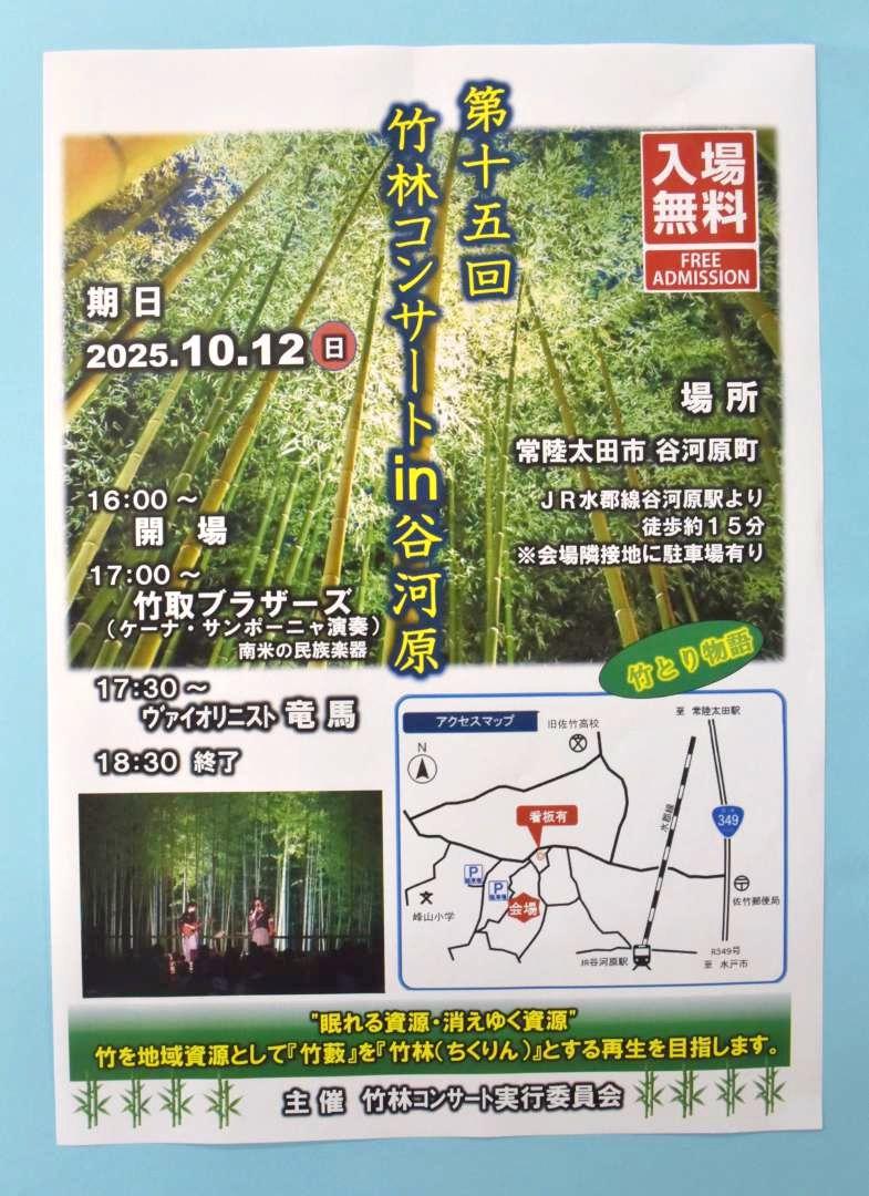 茨城県常陸太田市谷河原町の竹林を舞台にした「第15回竹林コンサートin谷河原」が12日午後5時から開かれる。バイオリニストの竜…
