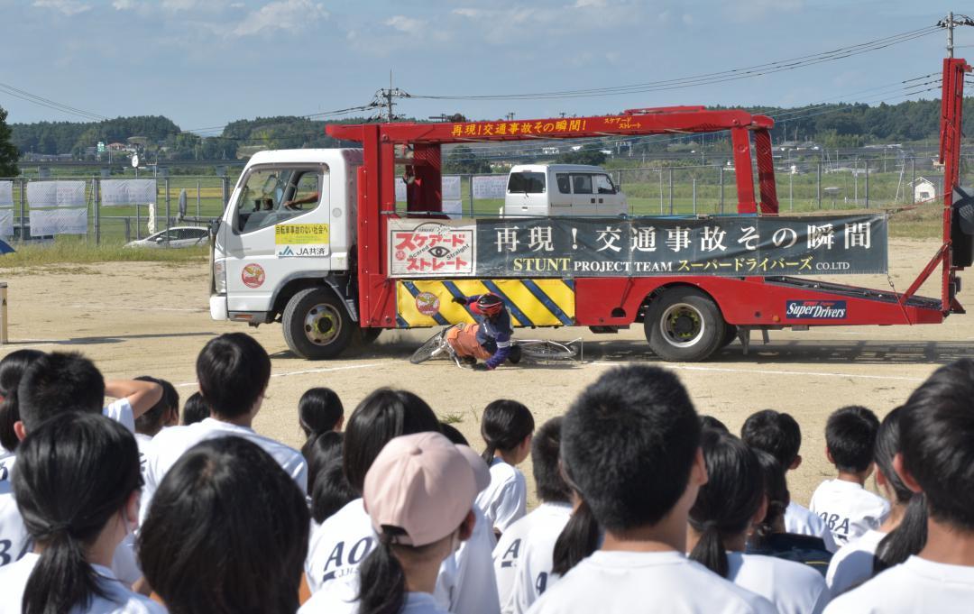 スタントマンが交通事故を再現し、注意を促すスケアード・ストレイト教育技法を使った交通安全教室が9月26日、茨城県茨城町奥谷…