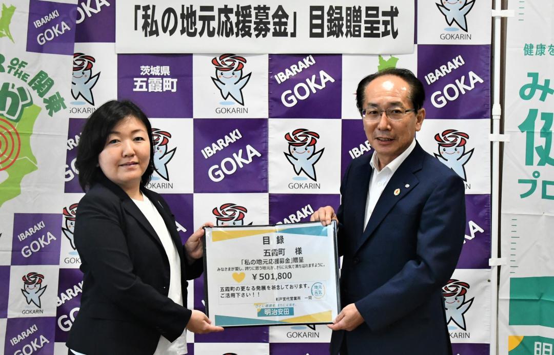明治安田生命保険埼玉東支社(中村朝啓支社長)は1日、「私の地元応援募金」として、茨城県五霞町に50万1800円を寄付した。町は町…
