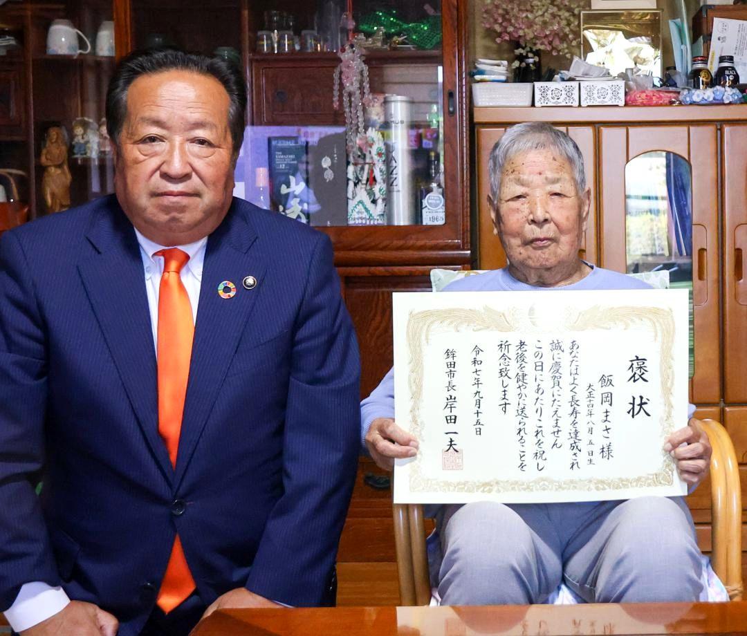 本年度中に100歳を迎える市民の長寿を祝おうと、茨城県鉾田市の岸田一夫市長が9月24日、対象者を訪ね、褒状や記念品を贈った。 …