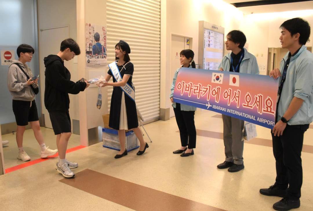 茨城空港(茨城県小美玉市)-韓国・清州(チョンジュ)間の定期便増便を記念し、県職員らが5日、増便で初めて茨城空港に到着した利…