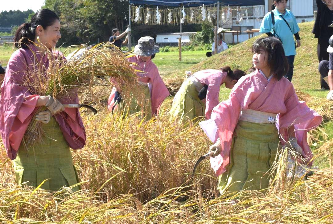 米の大切さを知ってもらおうと、茨城県神社庁(同県水戸市三湯町)の御神饌田(ごしんせんでん)で9月27日、稲穂を刈る神事「抜穂祭…