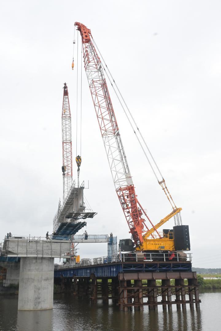 首都圏中央連絡自動車道(圏央道)の4車線化工事に伴い、茨城県稲敷市の小野川をまたぐ江戸崎橋でクレーン2台で橋桁をつり上げる…