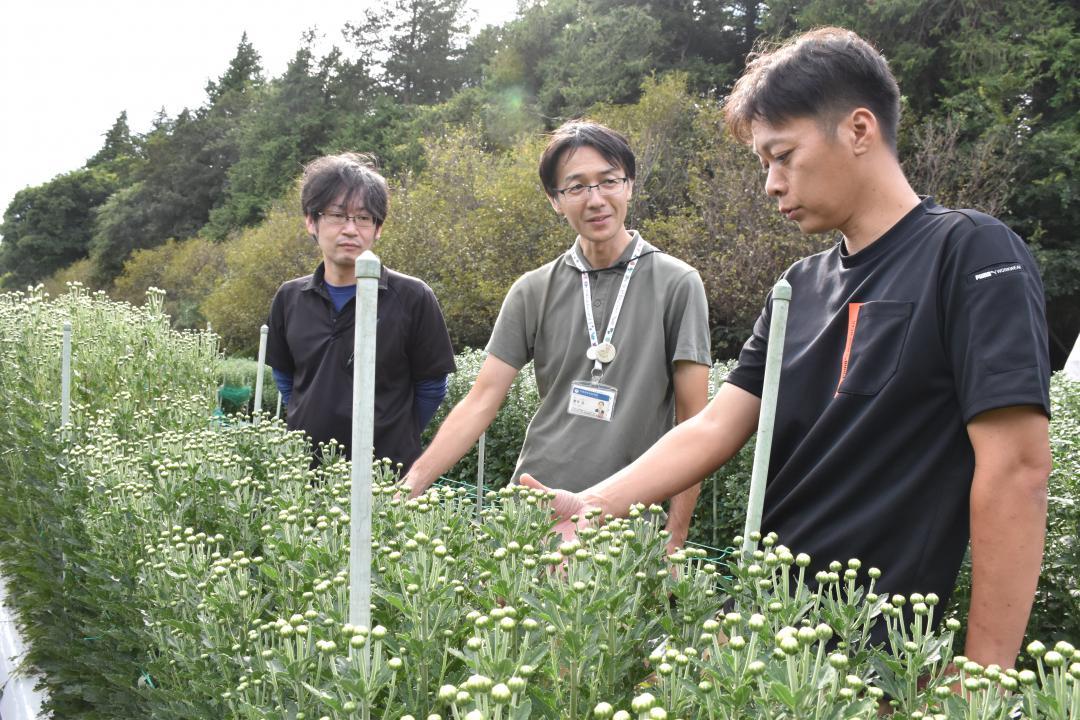 ■需要期出荷へ新品種試験 自助努力で収入増目指す 茨城県笠間市湯崎の畑に、きれいな列を成して小ギクが並ぶ。栽培するJA常…