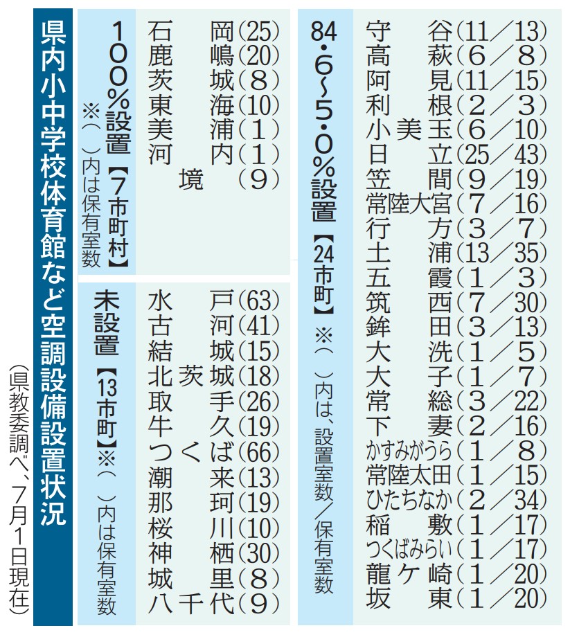 茨城県内公立小中学校の体育館などへの空調設備の導入が進んでいる。県教育委員会の調査によると、7月1日時点の設置率は23.9%。…