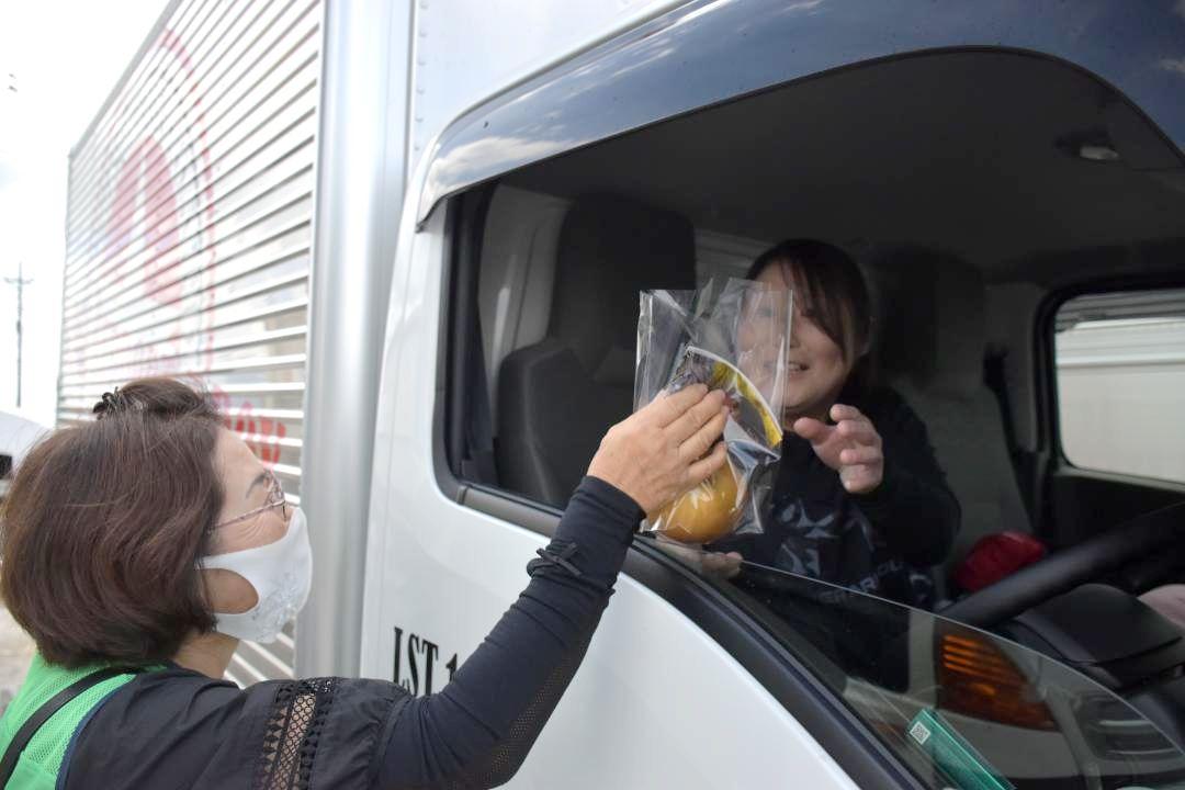 秋の全国交通安全運動に合わせ、茨城県筑西市特産のナシを運転手に配って「事故なし」を呼びかける街頭キャンペーンが24日、同…