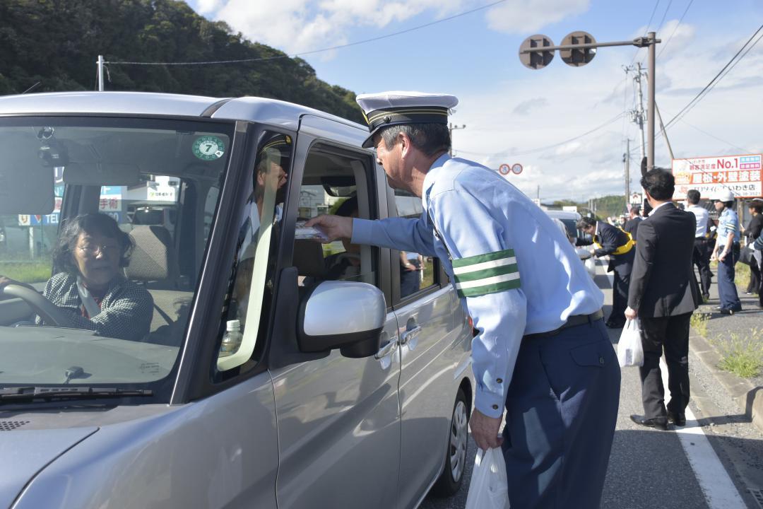 秋の交通安全運動(21~30日)を前に、茨城県警高萩警察署と福島県警いわき南警察署は19日、福島県いわき市勿来町の国道6号の交差…