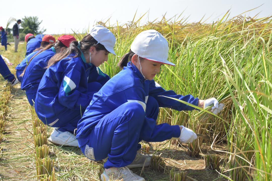 茨城県下妻市高道祖の市立高道祖小(安達恵子校長)の児童が17日、学校近くの田んぼで稲刈りを体験した。5年生約20人が参加し、慣…