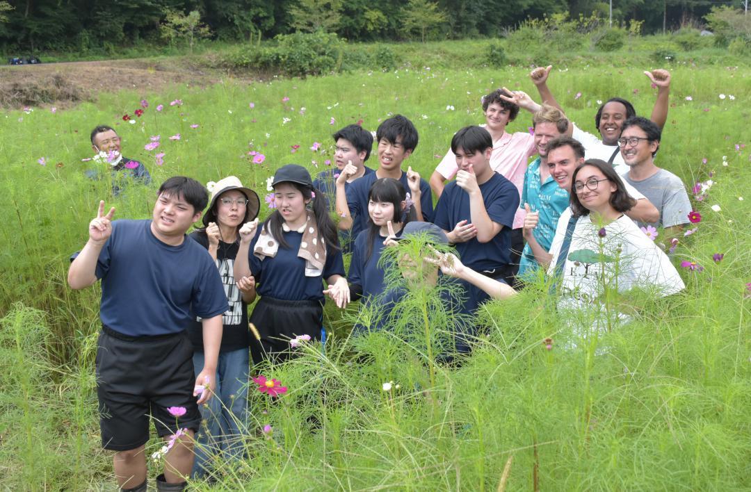 茨城県立北茨城特別支援学校の生徒が同県北茨城市関本町富士ケ丘の休耕畑にまいたコスモスが開花し18日、生徒が畑の見学に訪れ…