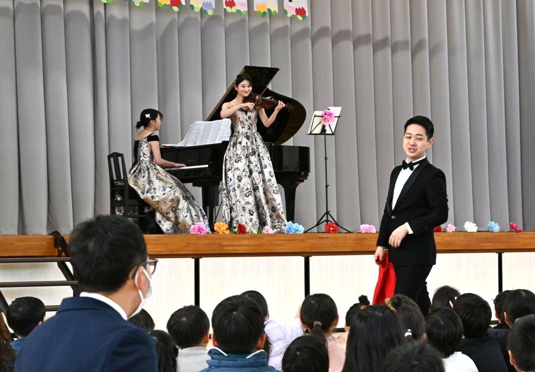 茨城県守谷市松ケ丘の市立松ケ丘小で4日、体育館の大規模改修工事の完了を祝って、卒業生の音大生ら3人が全校生徒約530人にこけ…