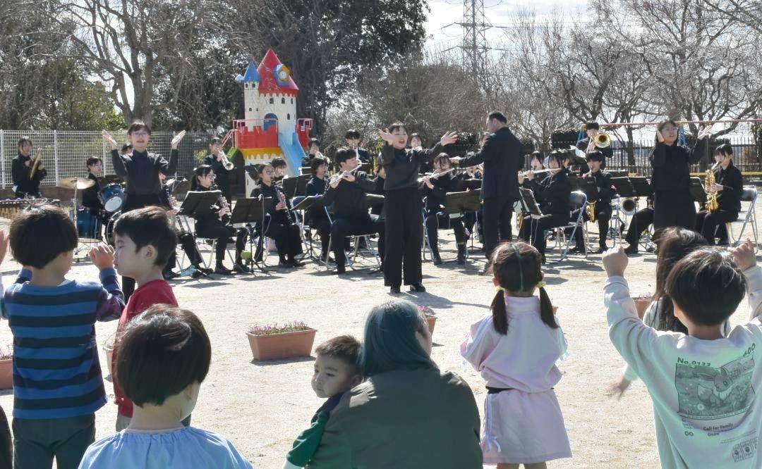 茨城県古河市尾崎の認定こども園なさきで7日、同市立三和、三和北、三和東の3中学校合同の「三和ユナイテッド吹奏楽団」による…