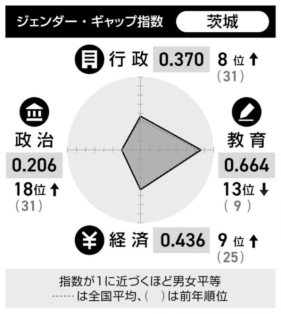2026年の都道府県版ジェンダー・ギャップ指数で、茨城県は行政が0.370の8位となり、0.282で31位だった25年から順位を大きく伸ば…