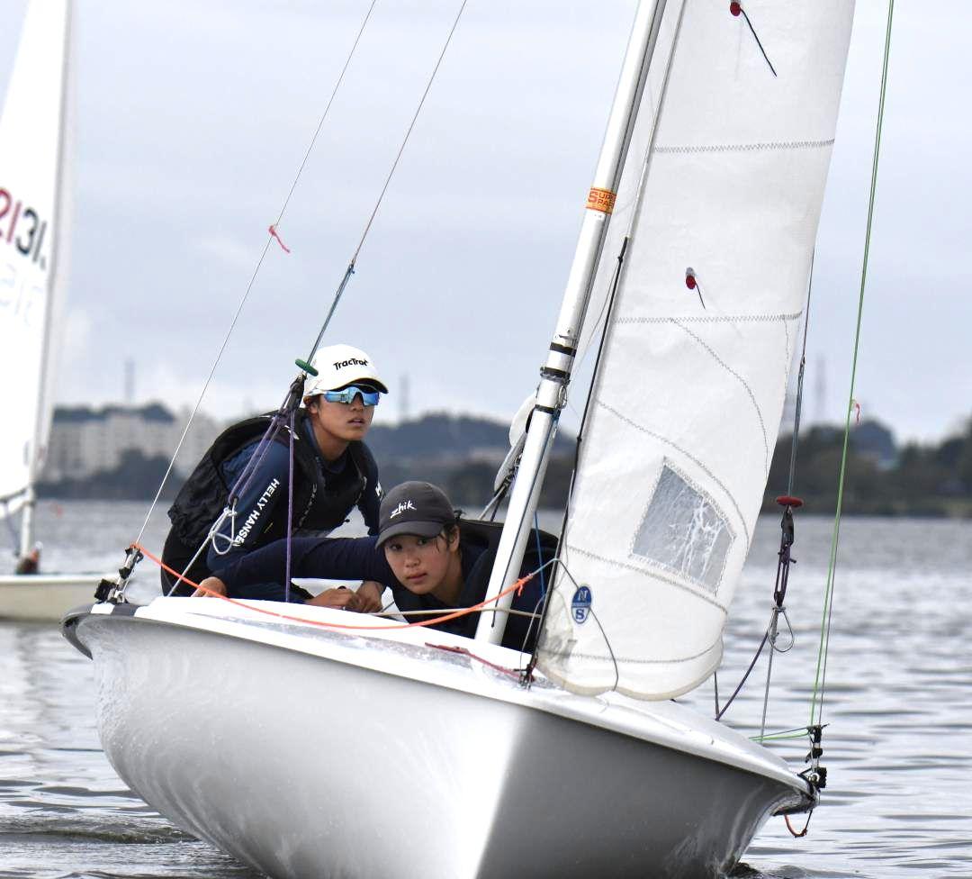 ■相性抜群、栄冠挑む セーリング少年女子420級に出場する鈴木しおん(霞ケ浦高3年)・実松莉歩(同2年)組は抜群のコンビネーシ…