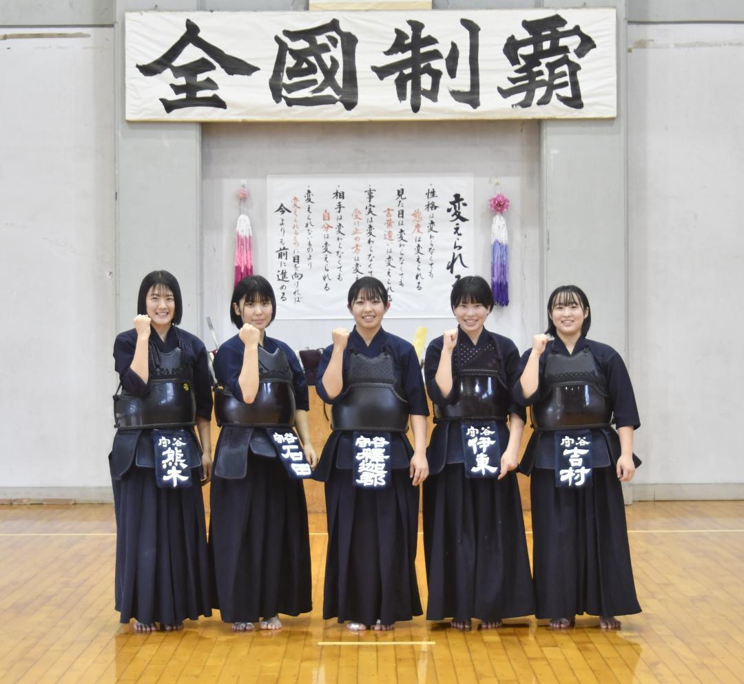 ■全国制覇へ士気十分 悲願の全国制覇へ。少年女子に出場する守谷高剣道部の士気は高い。 主力の釈迦郡日菜主将(3年)、石…