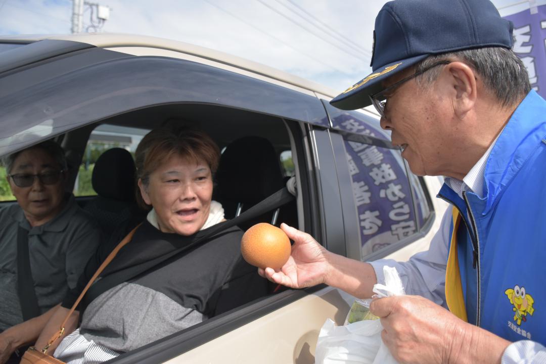 茨城県筑西市特産のナシを運転手に配って「事故なし」を呼びかける街頭キャンペーンが9月29日、同市関本下であり、参加者は信号…