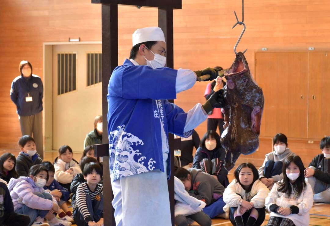 地元特産のアンコウについて理解を深めてもらおうと、茨城県北茨城市大津町の市立大津小(小浜靖彦校長)で17日、つるし切りの見…