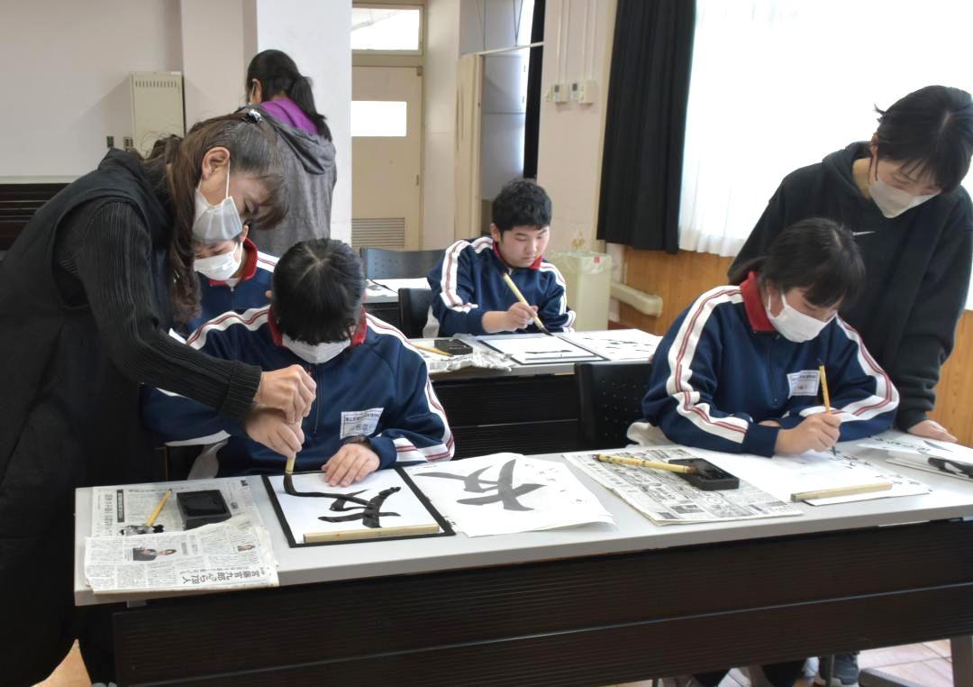 茨城県笠間市鯉淵の県立友部特別支援学校(鈴木和子校長)で20日、ゲストティーチャーを招いた書道教室が行われ、中学部生徒10人…
