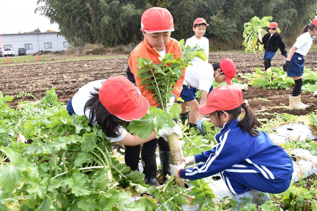 茨城県古河市立駒込小(同市駒込、山下尚美校長)の2、3年生計49人が20日、同校近くの畑で大根の収穫を体験した。児童らは「大き…