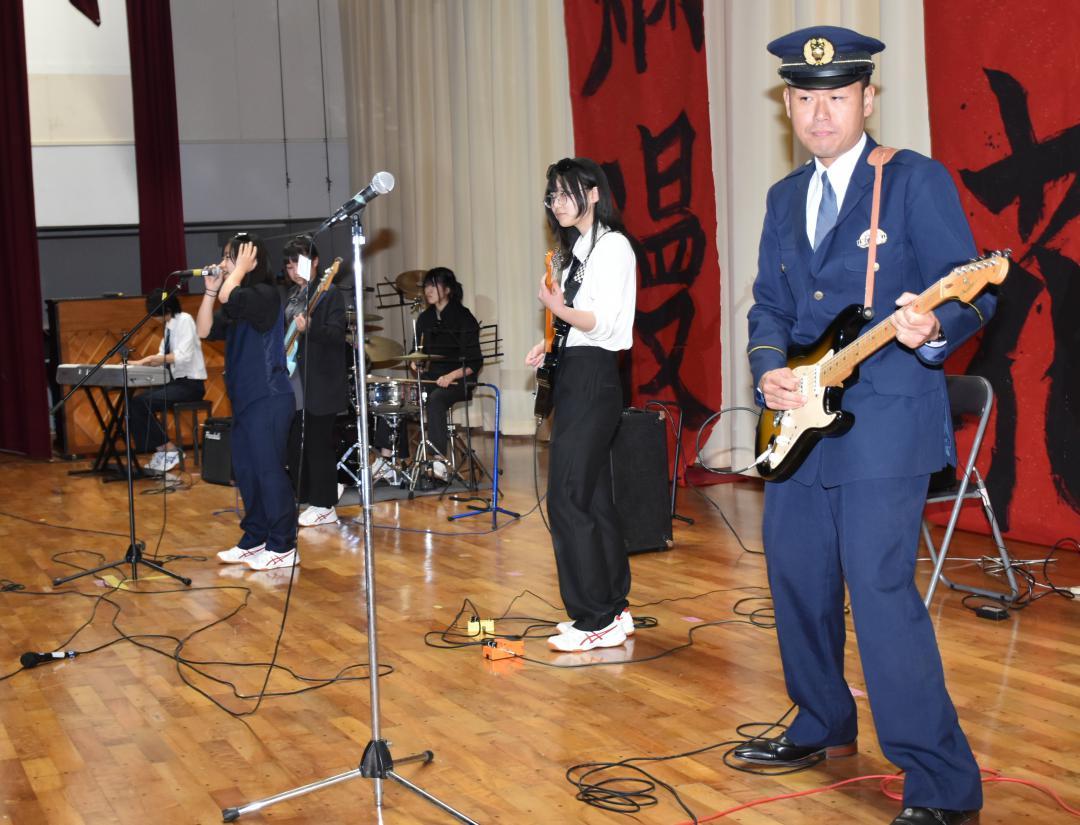 高校文化祭の軽音楽部のステージに、茨城県警鉾田警察署の警察官がギター片手に参加し、部員らと息の合ったバンド演奏を披露し…