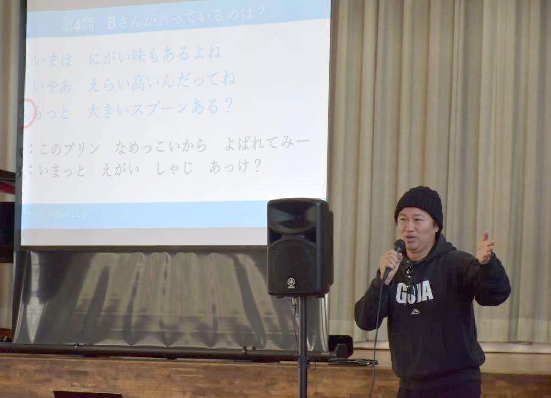 「茨城王(イバラキング)」で知られる青木智也さんを招いた講話「ラップで学ぶ!いばらきことば」が11月27日、茨城県常総市立飯沼…