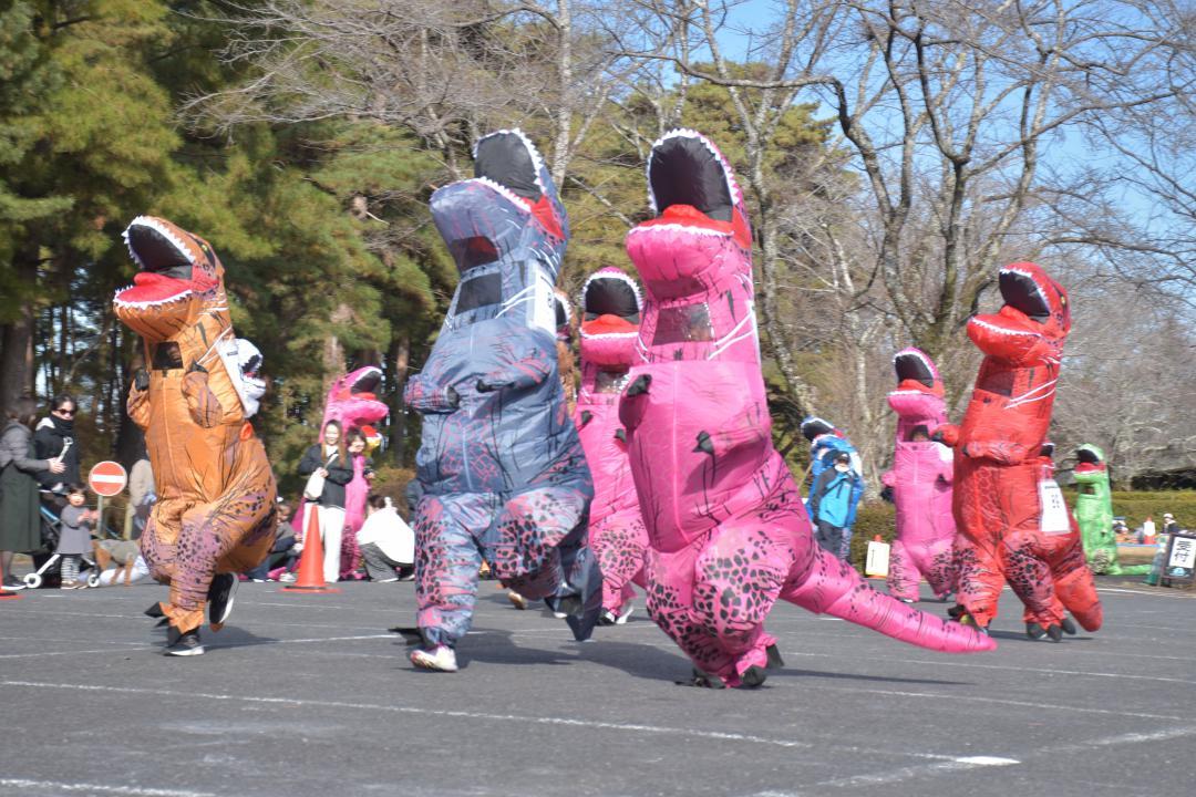 古代の暴君、水戸の冬を駆ける-。ティラノサウルス(和名・暴君竜)の着ぐるみを着て走る「ティラノサウルスレースin水戸市森林公…