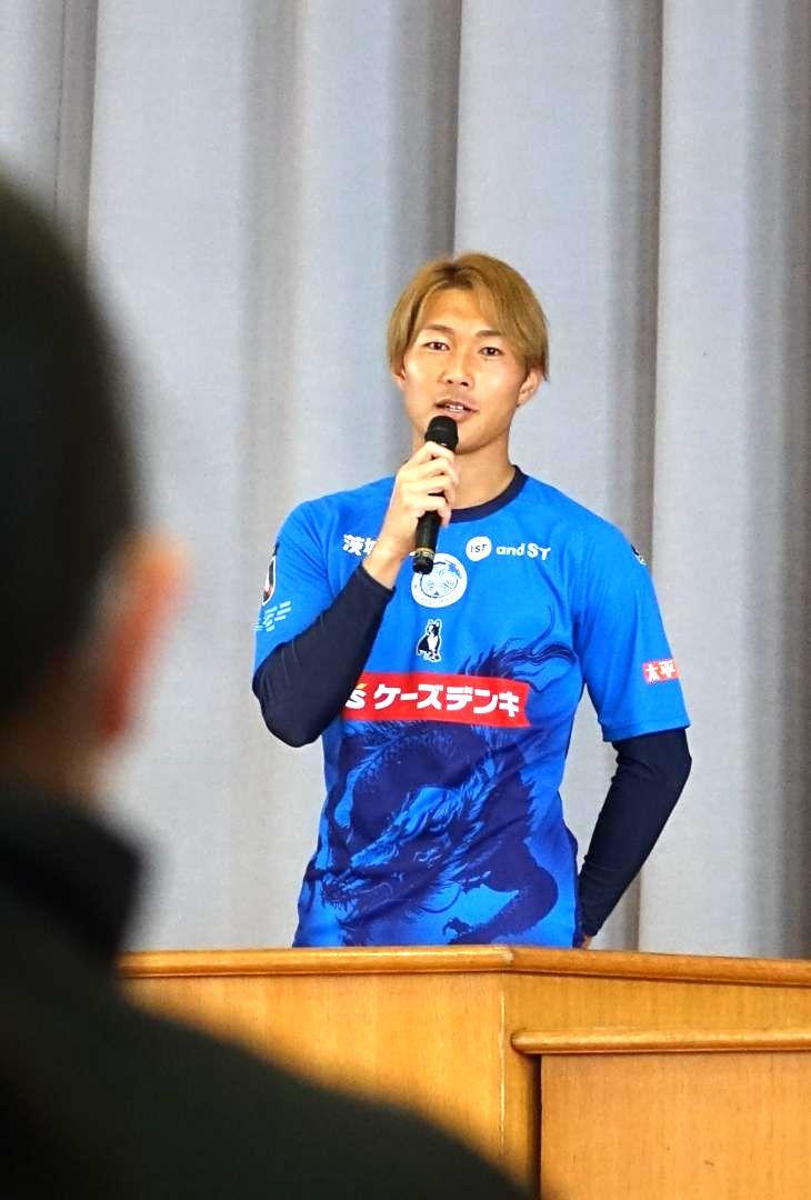 J1水戸ホーリーホックの飯田貴敬選手(31)が10日、茨城県筑西市岡芹の市立下館中(田崎諭校長)を訪れ「夢への挑戦」をテーマに講…