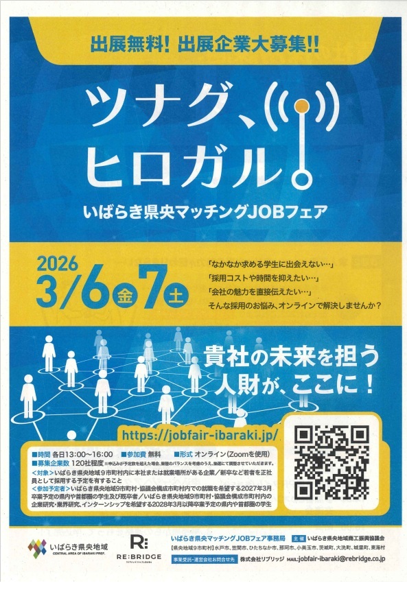 茨城県央地域で就職先を探す大学生や高校生のための合同企業説明会「いばらき県央マッチングJOBフェア」が来年3月6、7の両日、…
