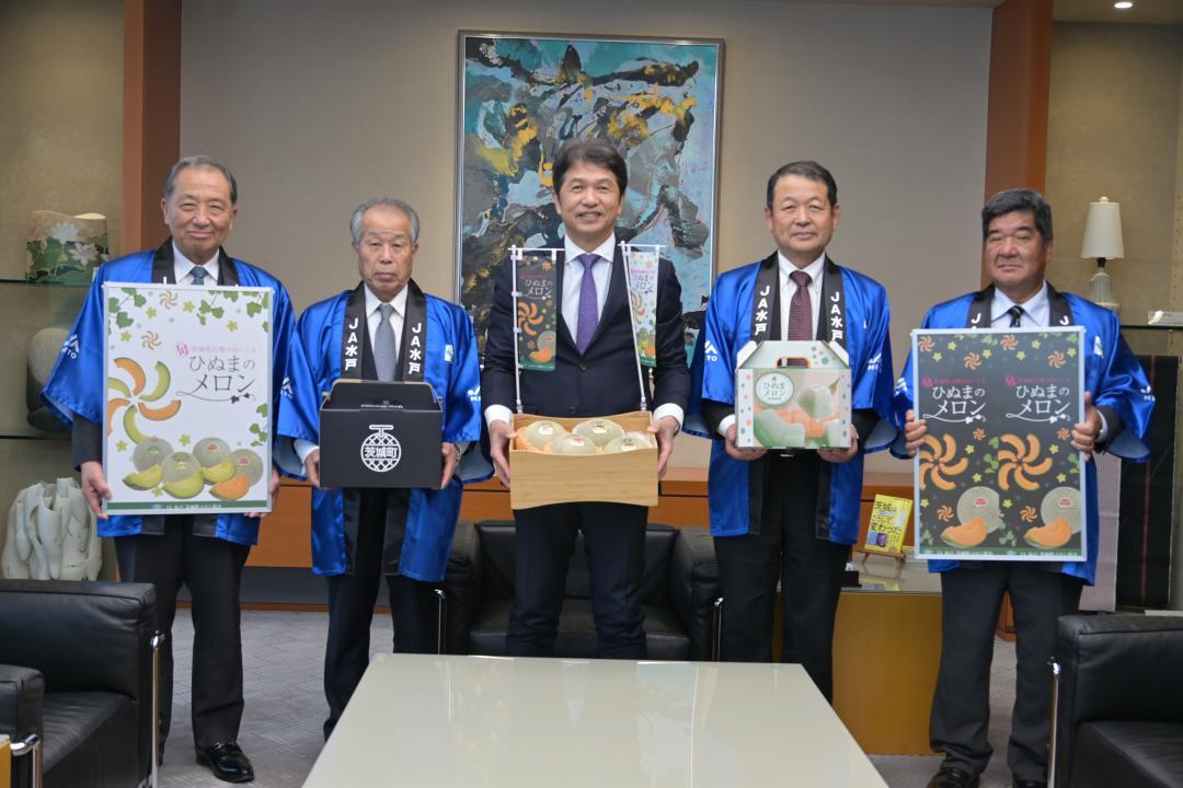 JA水戸茨城町メロン部会の関係者らが2日、茨城県庁に大井川和彦知事を表敬訪問し、地元メロンのおいしさをPRした。 県内有数…