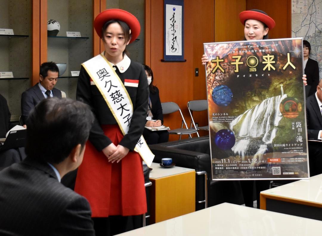秋から冬にかけての茨城県大子町の観光PRで、「奥久慈大子大使」の藤田暢さん(23)と高橋実子さん(50)らが25日、県庁に大井川和…
