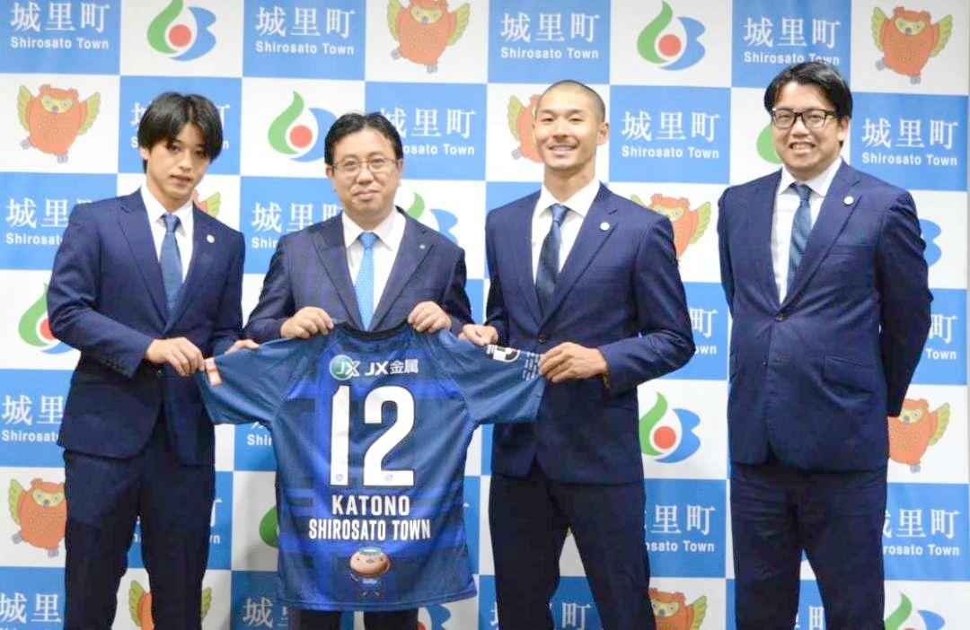 サッカーJ2水戸ホーリーホックの茨城県城里町PR大使を務める梅田魁人選手と新井瑞希選手らが10月22日、同町石塚の町役場を訪れ…