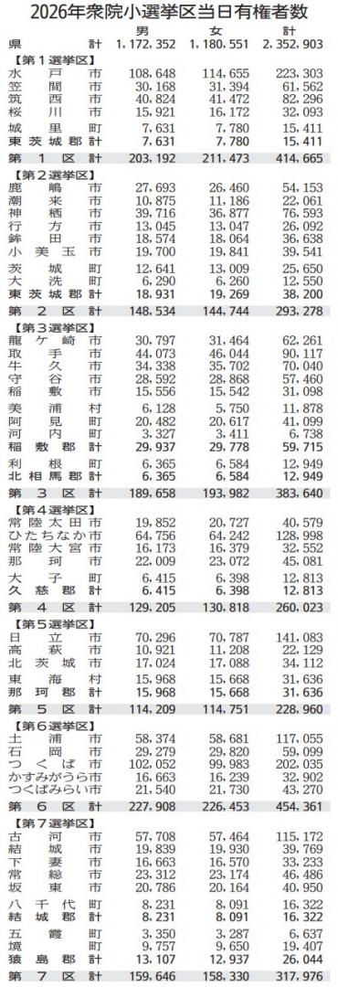 8日投開票の衆院選で、茨城県選管は7日、当日有権者数(見込み)を235万2903人と発表した。男117万2352人、女118万551人。 202…