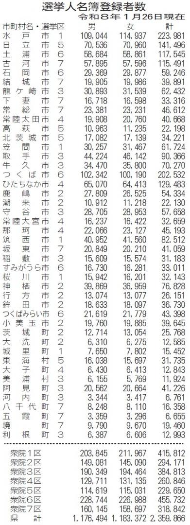 27日公示、2月8日投開票の第51回衆院選で、茨城県選管は26日、県内選挙人名簿登録者数(有権者数)を235万9866人(男性117万人6494…