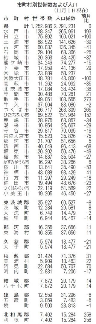 茨城県は8日までに、11月1日時点の県人口をまとめた。総人口は279万1231人で、10月1日から横ばいだった。 10月中に自然動態(…