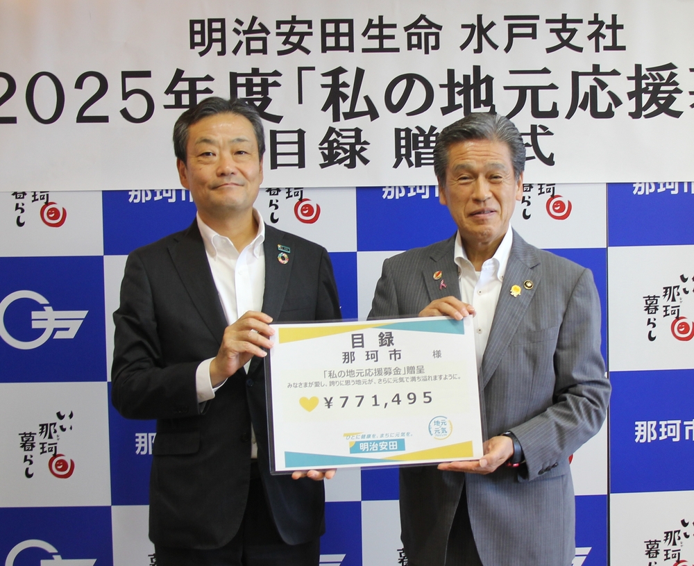 地域貢献活動の一環として、明治安田生命保険は10日、茨城県那珂市に77万1495円を寄付した。同社の砂永一浩関東北地域…