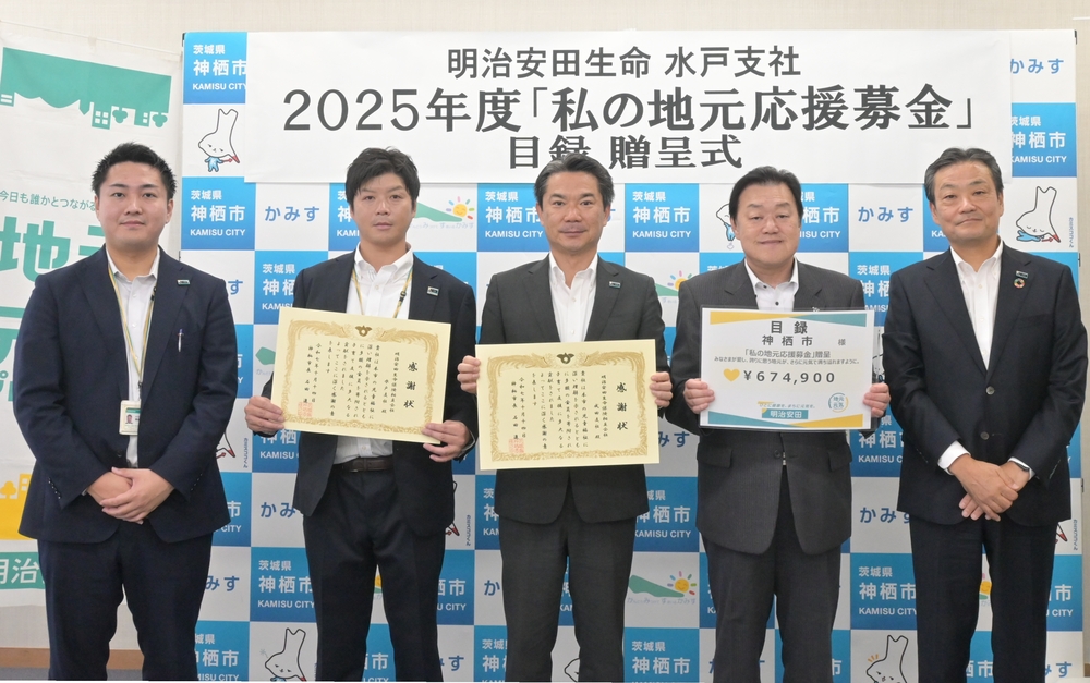 明治安田生命水戸支社(中平泰弘支社長)と同成田支社(片岡健二支社長)は14日、「私の地元応援募金」として、茨城県神栖市に6…
