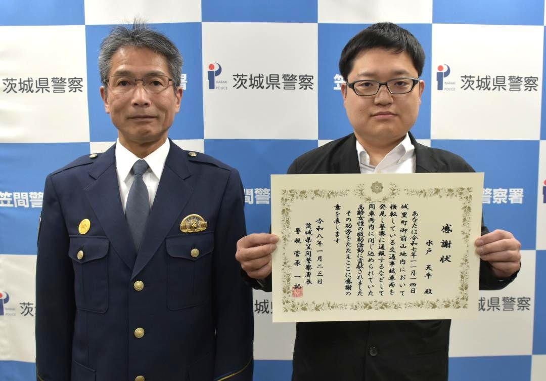 交通事故当事者の早期救助に貢献したとして茨城県警笠間警察署(菅原一記署長)は1月23日、埼玉県さいたま市の不動産業、水戸天平…